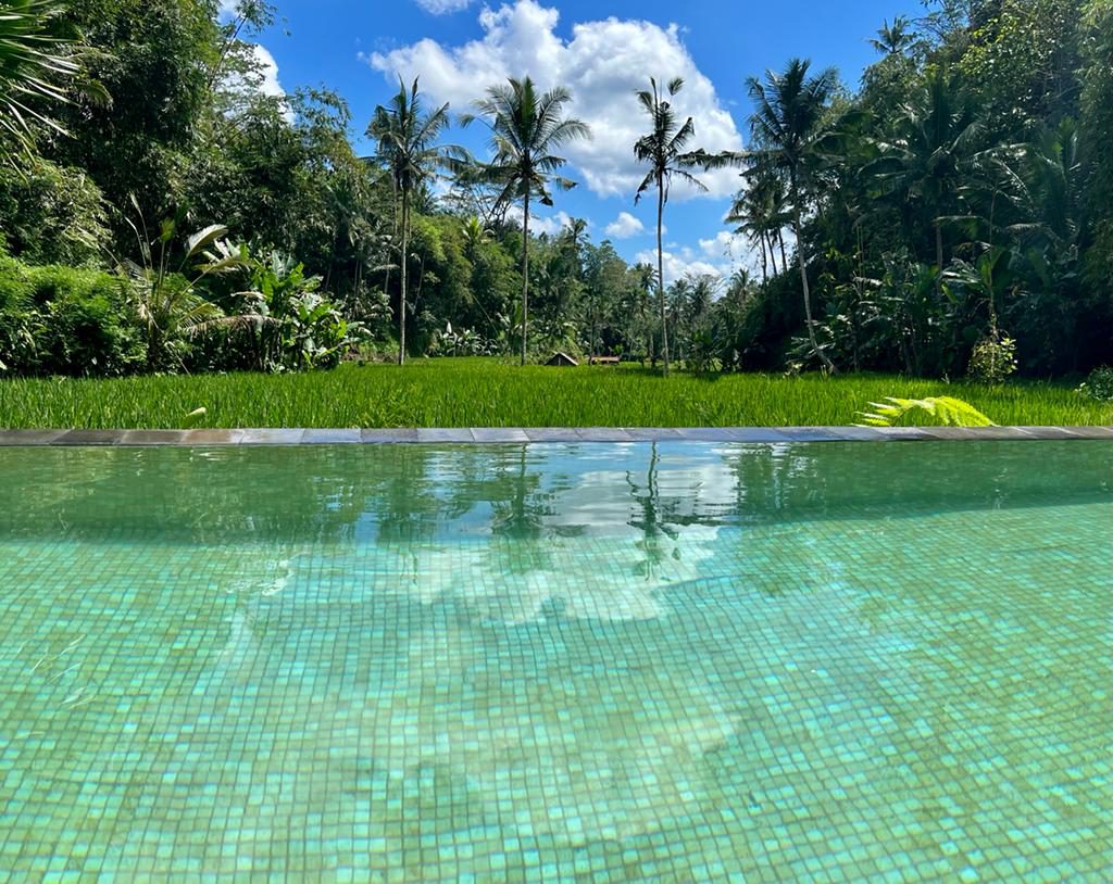 Villa Heaven features a spacious living room overlooking the rice fields, a kitchen with a bar, three bedrooms, a pool that extends toward the rice fields, and a serene gazebo above a pond teeming with fish.